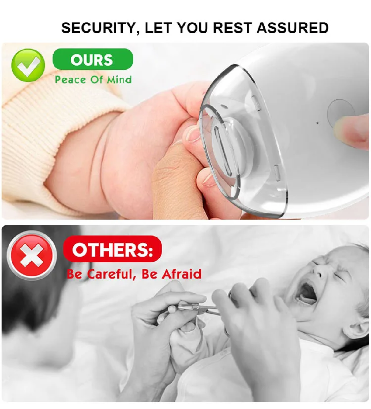 Whisper Quiet: Operates with ultra-low noise technology (<25 dB). You can use it to trim your baby's nails while they sleep soundly without them noticing!